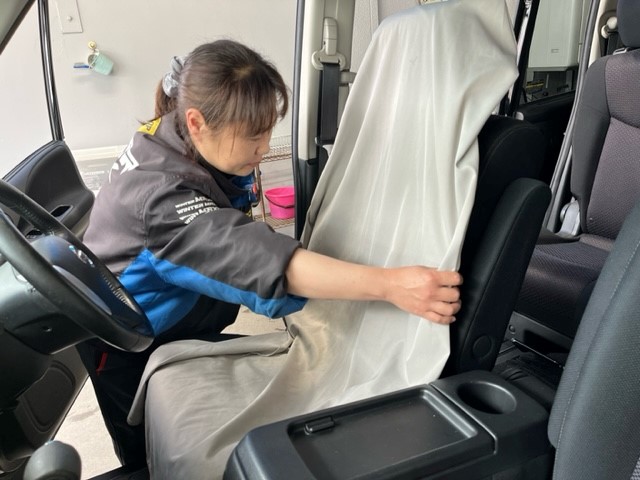 お車に配慮し、シートカバー、紙マット(足元マット)で保護してから検査に入ります。